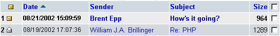 The Checkbox in the last column is for message selection and actions. By clicking one of the checkboxes, a small Checkmark will appear in the box. Clicking it again removes the checkmark. By clicking the checkbox utmost to the top (directly right of "Size"), all of the checkboxes below it will be selected. This tool is for performing actions on selected messages. More will be discussed on this topic in Using the Toolbar. |