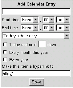 To add an entry, type your memo in the text field under Add Calendar Entry. You then will need to select the time(s) at which the event will take place. Beside "Start Time", select the hour, minutes, and the time of day it will take place (AM or PM -- Morning or Afternoon). You can also select the "End Time" of the event (follow the same instructions as the "Start Time"). If you select "None" for the "Start Time", the event will